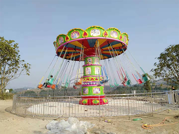 oscilante de silla voladora es uno de los columpios del parque de atracciones que muy popular entre los turistas. El plato grande se ve como un gran paraguas y muchas sillas hermosas, exquisitas y seguras que cuelgan bajo el “paraguas”. El giro del carrusel es fiesta volando muy popular en los parques de atracciones Tanto los adultos como los niños adoran jugar este juego volador, ya que es emocionante pero no muy emocionante. Cuando el paraguas comience a dar vueltas, las sillas girarán en el aire. La gente se divertirá mucho con este equipo. .
