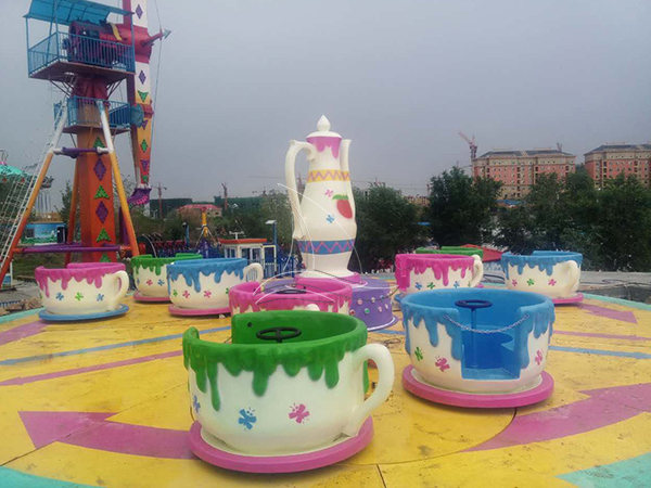 Las tazas de té son cabañas de pasajeros. Las tazas de paseo no solo giran alrededor de su eje central, sino que también giran alrededor del centro de la pequeña plataforma giratoria. Al mismo tiempo, la pequeña placa giratoria gira el centro de la gran plataforma giratoria.